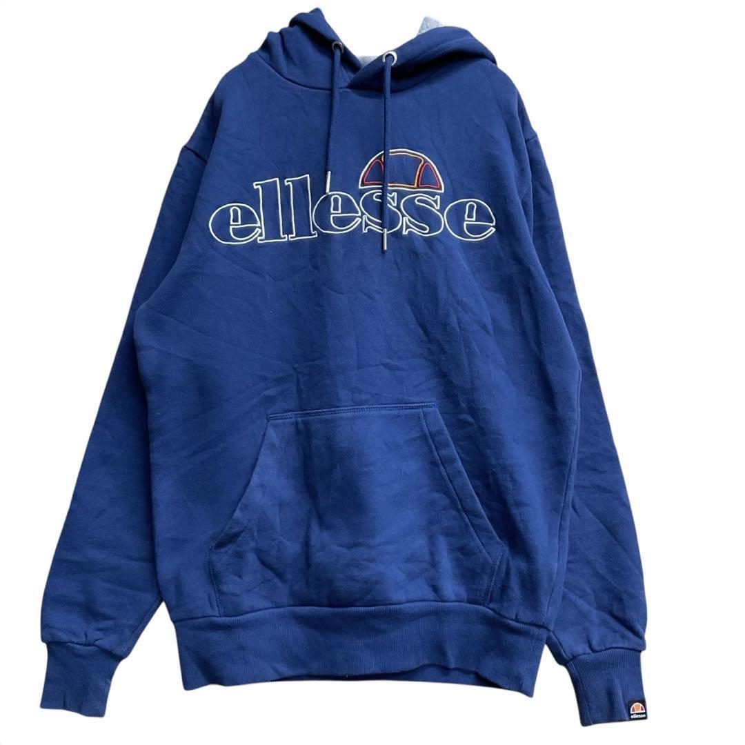 - エレッセ メンズパーカー S 青 ロゴ刺繍 ポケット 裏起毛【2087】