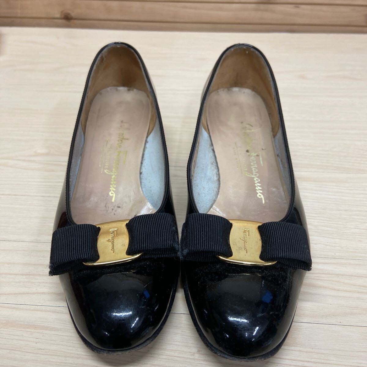 > 4 サルヴァトーレフェラガモ ヴァラリボン パンプス 靴 ブラック系 エナメル 7C ゴールド金具