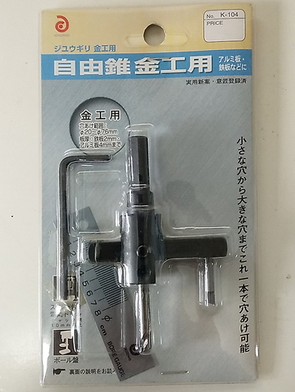 神沢 自由錐金工用 K-104小さな穴から大きな穴までこれ1本で穴あけが可能です。鉄板やアルミ板などの穴あけに最適です。誕生50年以上の信頼と実績のロングセラー品。コンパクト設計で、壁際や角での穴あけ作業に最適です。工具不要、蝶ねじで簡単に穴径を調節可能。材質(刃/ドリル)ハイス鋼/ハイス鋼シャンクの形状 10mm三面軸対応電動工具 ボール盤(スタンド付電気ドリルも含む) 10mm以上穴あけ範囲 Φ20~76mm主な適応材と穴あけ深さ鉄板 2mm・アルミ板 4mmまで※こちらの商品は店頭販売品となります。長期店舗在庫の為、多少の傷・汚れがついてる場合が御座います。商品は間違いなく未使用となっております。上記条件をご理解の上、ご購入をお願いします。ノークレーム・ノーリターンにてお願いします。