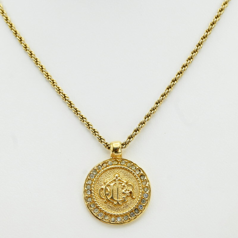 > K02-k073 Christian Dior クリスチャンディオール ロゴ ラウンド ラインストーン GP ネックレス ゴールド