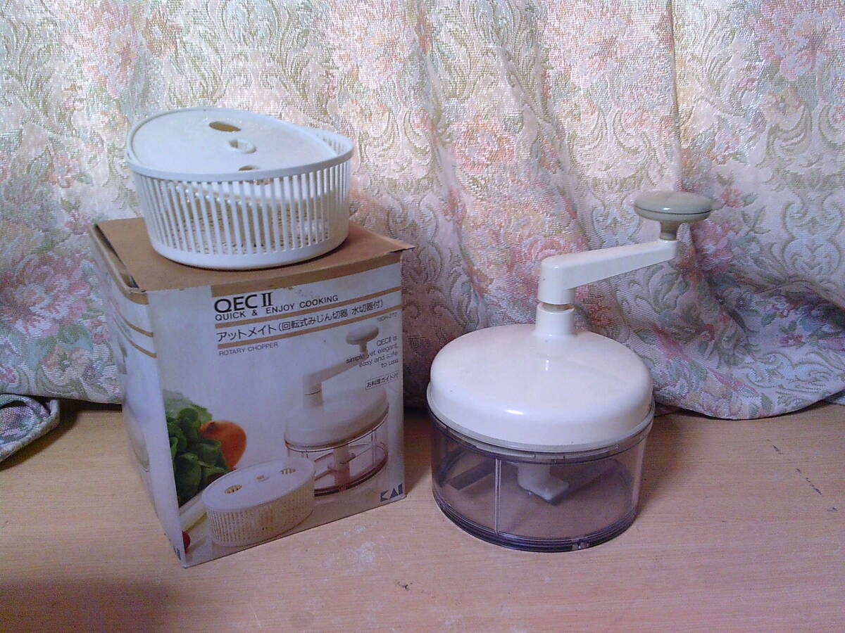 - ■ く-526 回転式みじん切器 水切器付 未使用保管品 アットメイト 貝印特販 お料理ガイドなし ※箱寸)高19cm 幅17cm 奥17cm 全重550g
