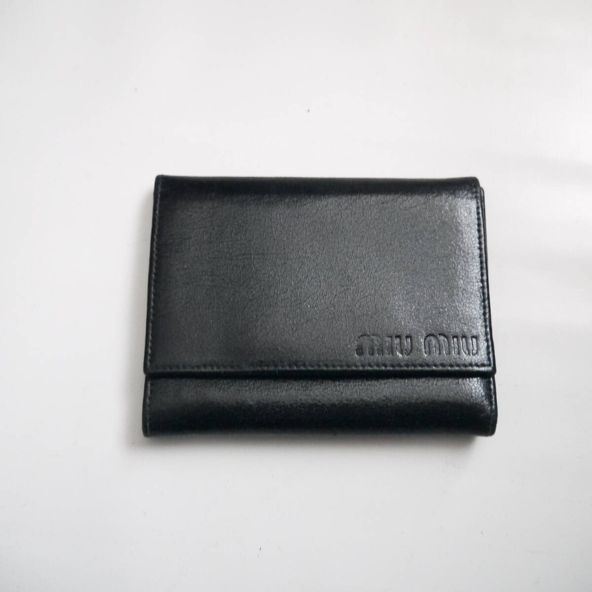 > $ 美品 $ 激レア!■ ミュウミュウ ■ miumiu ■ ロゴ入り 本革 レザー製・ 3つ折り 財布 ■ 黒 ブラック■レトロ ヴィンテージ■送料無料