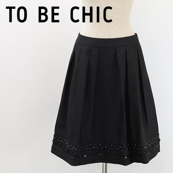 - 新品◆TO BE CHIC トゥービーシック スパンコール&ビーズ装飾 シャンタン タック フレア スカート 黒 ブラック 42