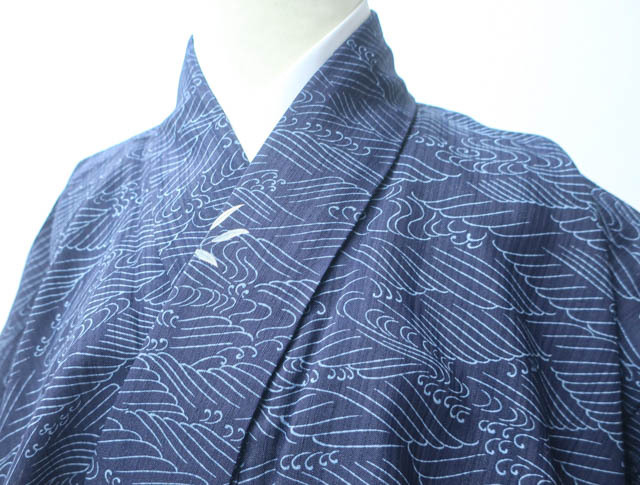- 《古美術京松》【着物】 小紋 夏物 夏 荒波に葉文様 バチ衿 身丈約165cm 裄丈約63cm R6Z-39