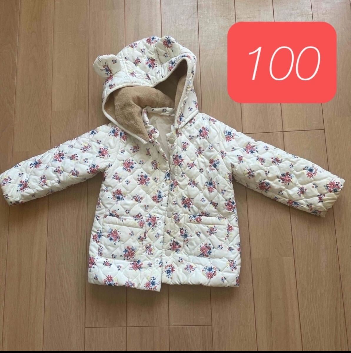 - 【訳あり特価!】女の子 ジャンパー 白 耳付き フード 花柄 100サイズ キッズ