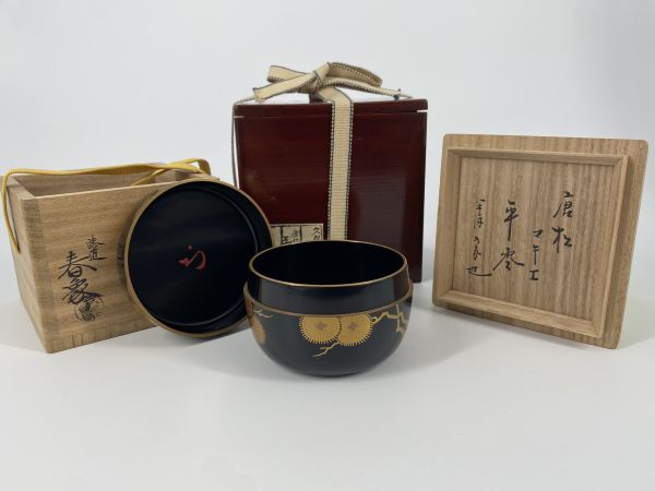 - 【雪華】☆年中使い☆ 春象 唐松蒔絵 平棗 久田 宗也 尋牛斎 書付 在判 茶道具 【 表 千家 而妙斎 即中斎 惺斎 宗哲 近左 光入 】