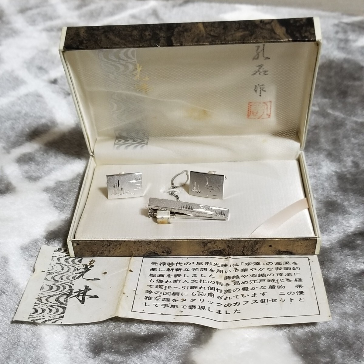 > T-376 メンズ アクセサリー 『光琳』孔石? 作 ネクタイピン & カフス 3点セット メタリック 手彫 タイピン 服飾小物 保管品 尾形光琳