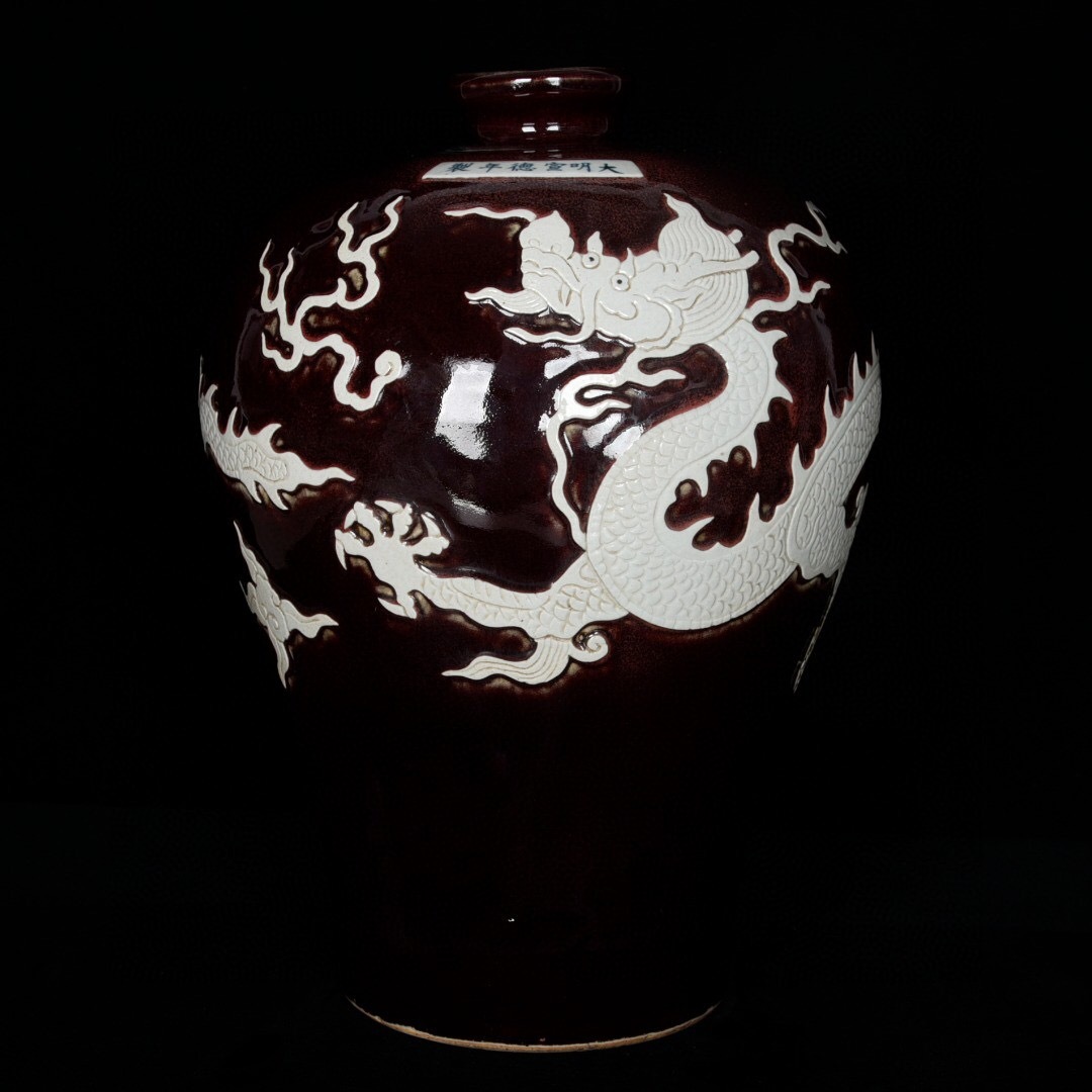 - 『館蔵珍品 明 宣德年製款 古陶瓷品 祭紅釉 留白 云龍紋 梅瓶』置物 賞物 貴重物品 収蔵品 中国古美術