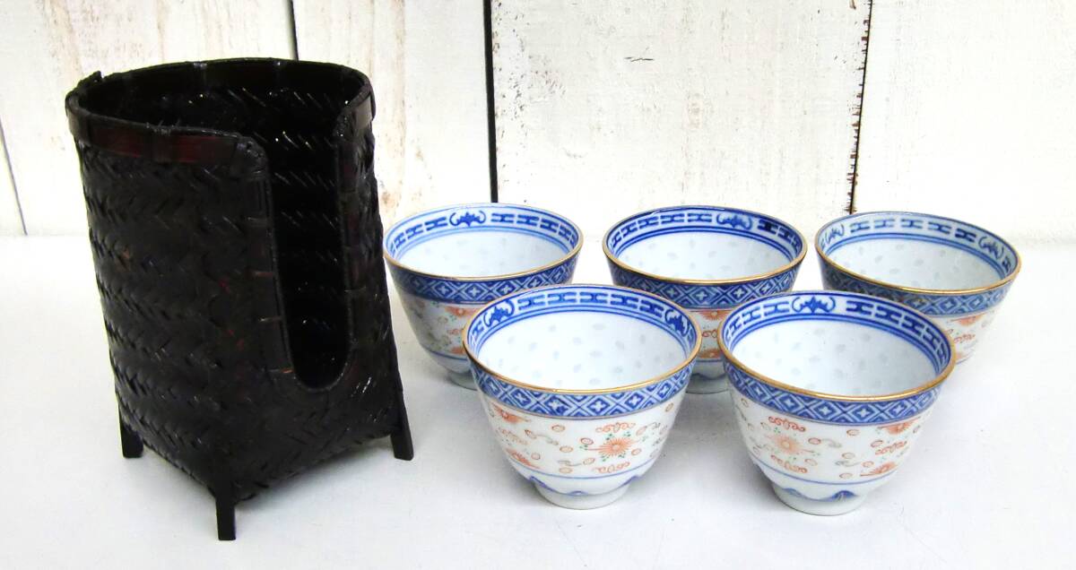 > *伝統工芸 工芸品 工芸美術 *中国 景徳鎮 MADE IN CHINA *茶器 湯呑 5点まとめ 5客 ホタル透かし 染付花模様 *竹製 碗筒 1点
