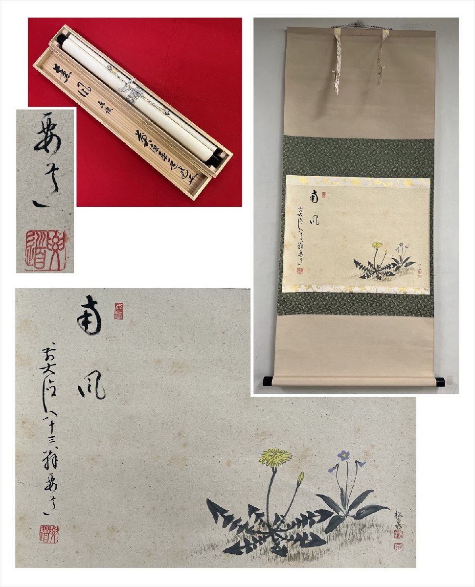 - 【千寿】大徳寺派 宗鏡寺 雪尾要道 薫風 蒲公英画賛 紙本 d1208◆在銘 箱 茶掛 掛軸 掛物 茶道具 100029989 箱と中身違う