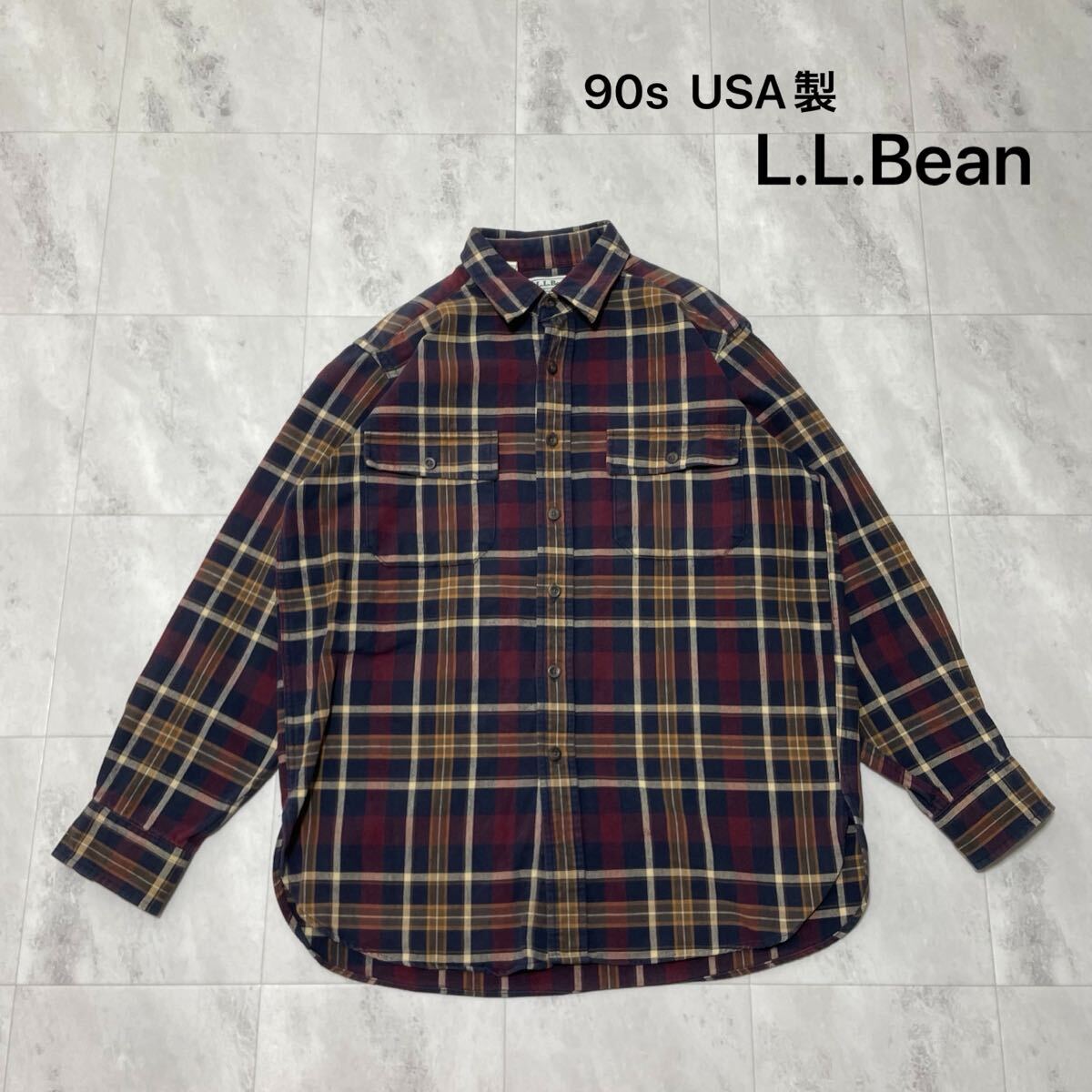 - 90s USA製 L.L.Bean エルエルビーン ネルシャツ 長袖 コットンシャツ アメリカ製 チェック柄 ネイビー ワインレッド サイズM 玉SS3157