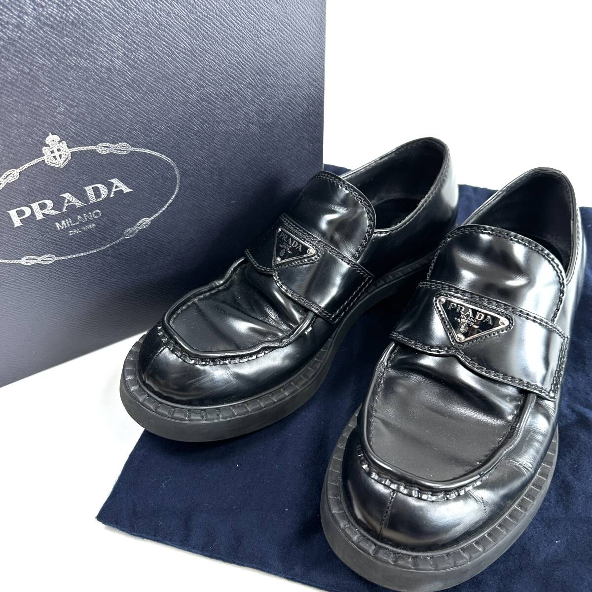 - 正規品◇PRADA プラダ チョコレート レザー ローファー トライアングルロゴ ブラック 7 1/2 メンズ ユニセックス