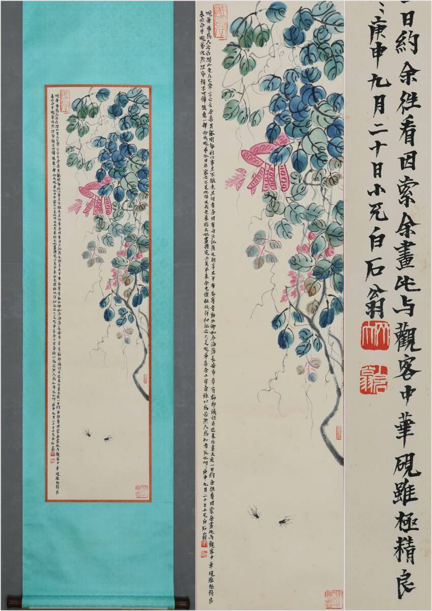 > 古美術 掛け軸 中国・近現代 「斉白石書」 紙本 【紫藤豆莢図】 立軸 書道 巻き物 肉筆保証 唐物 古画 画心138x35cm LT-250362