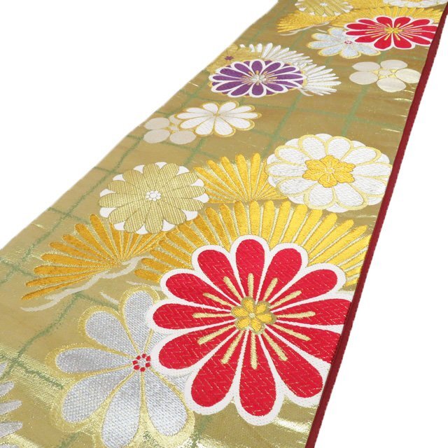 - 袋帯 振袖用 中古 リサイクル 正絹 フォーマル 仕立て上がり 六通 花模様 菊 梅 箔糸 多色 金 きもの北條 A1159-15