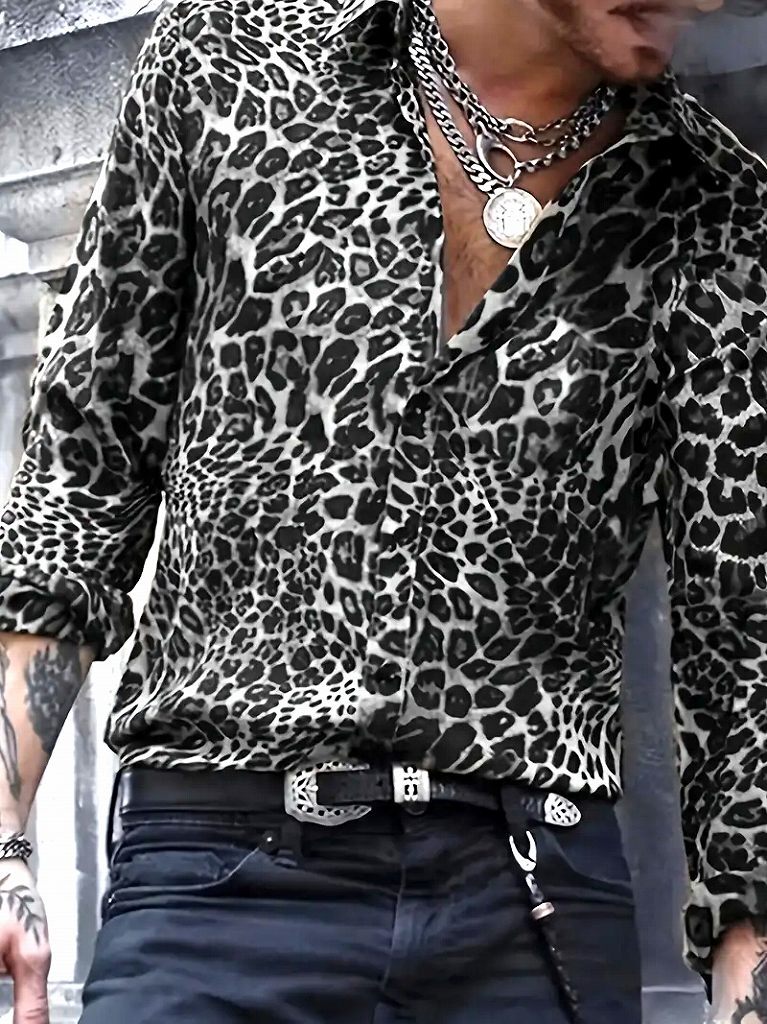 - ヒョウ柄グレー 長袖シャツ 045 柄シャツ Yシャツ ドレスシャツ 総柄 ヤクザ ヤンキー オラオラ系 服 派手 パーティー メンズ ファッション
