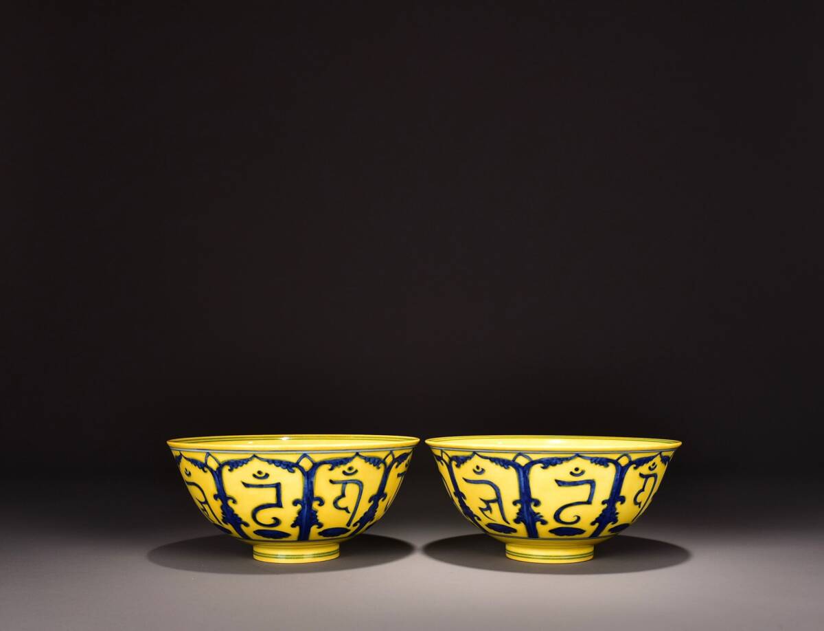 > 『館蔵珍品 明 成化年製款 古陶瓷品 黄釉 青花 梵文碗一對』置物 賞物 貴重物品 収蔵品 中国古美術