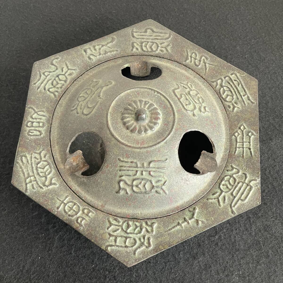 - 高岡美術 鋳物 金工 博堂作 灰皿 金属工芸 六角 象形文字 鉄器 骨董 美品