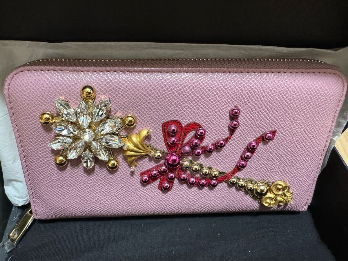 > 未使用●DOLCE&GABBANA ドルチェ&ガッバーナ レザー 長財布 ピンク ビジュー キラキラ系 ロングウォレット ラウンドファスナー