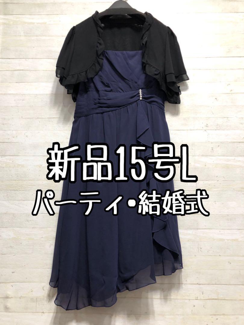 - 新品☆15号L紺系♪長め丈裾シフォンパーティーワンピース〇D653
