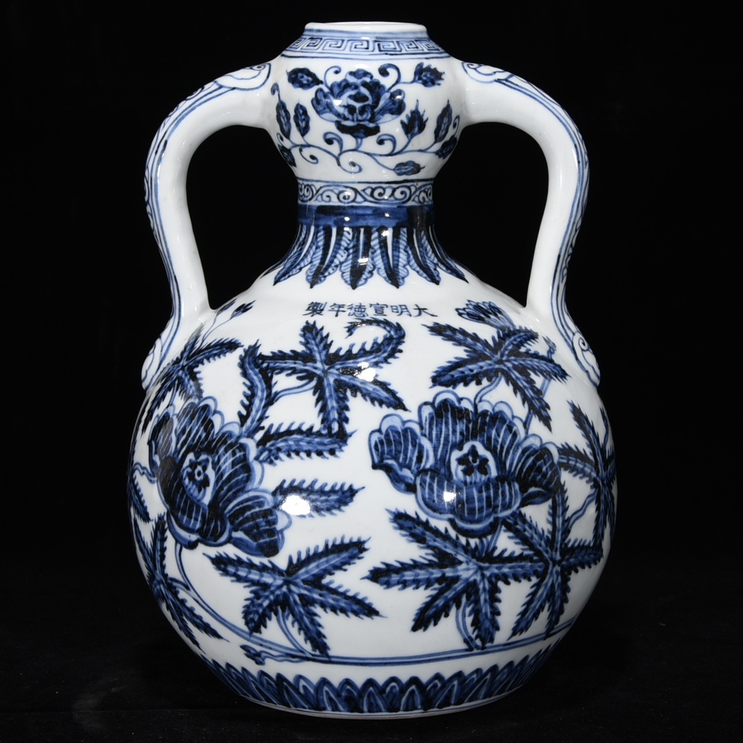 - 唐物 明 宣德年製 青花 花卉紋 雙耳 蒜頭瓶 陶芸 磁器 古陶磁器 中国美術品 時代物 D63