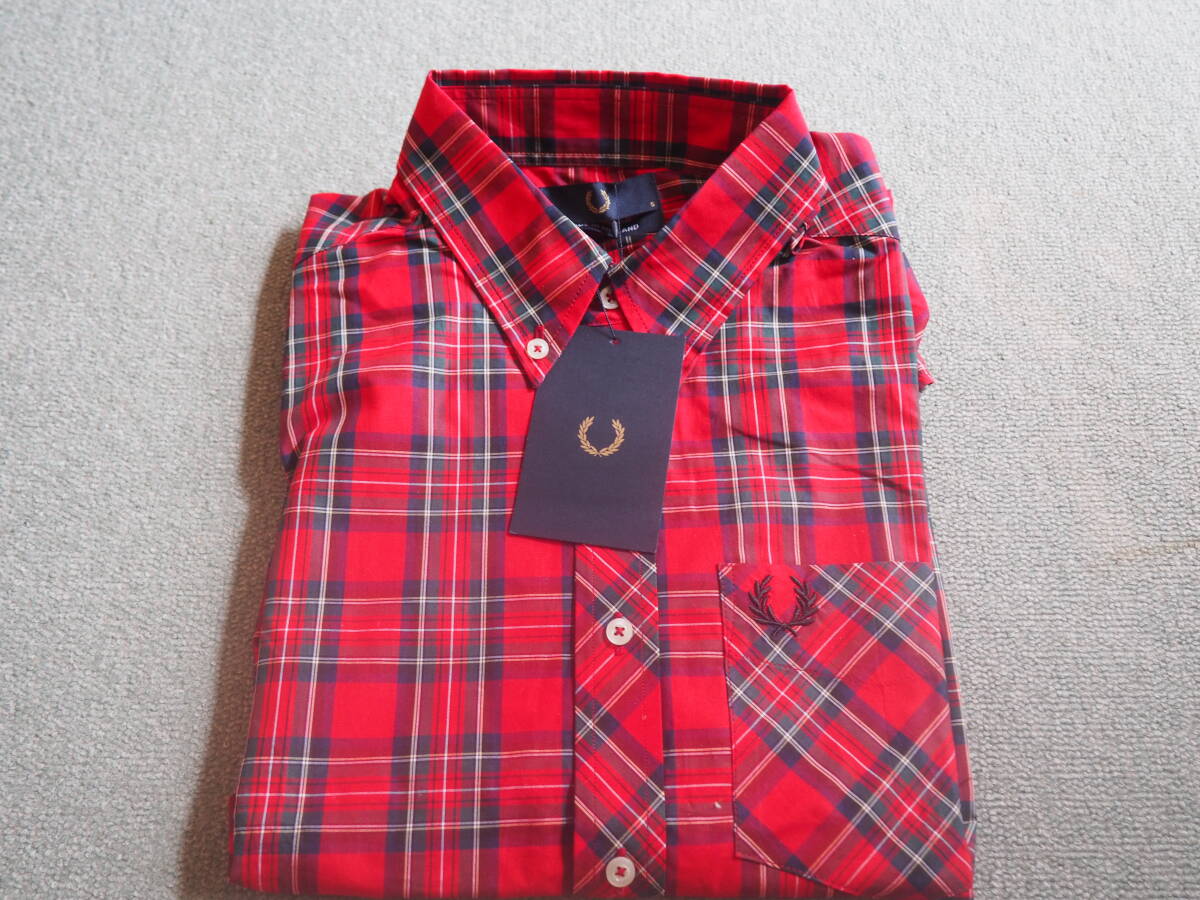 > 未使用保管品FRED PERRY/フレッドペリー 長袖ボタンダウンシャツUS/Sサイズレッド系タータンチェック柄英国製