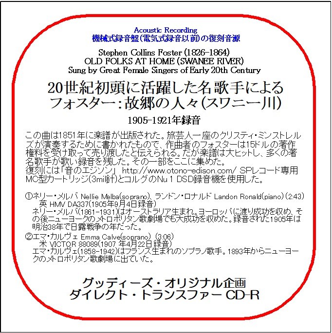 - 20世紀初頭に活躍した名歌手による「フォスター:故郷の人々(スワニー川)」/送料無料/ダイレクト・トランスファー CD-R