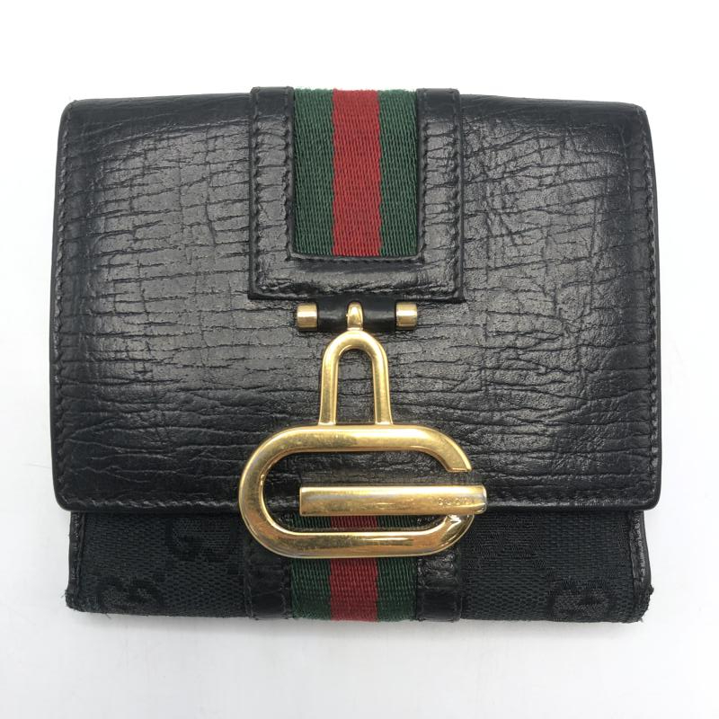 > 【中古】GUCCI Wホック二つ折り財布 131848.0416 ブラック グリーン レッド グッチ シェリーライン GGキャンバス[240024475254]