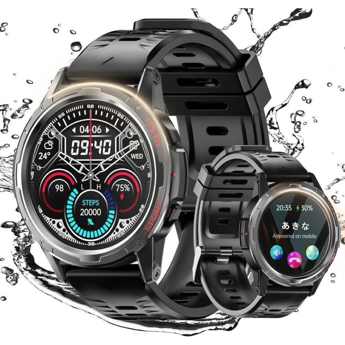- スマートウォッチ 軍用規格 Bluetooth通話付き 防水 丸型 ブラック