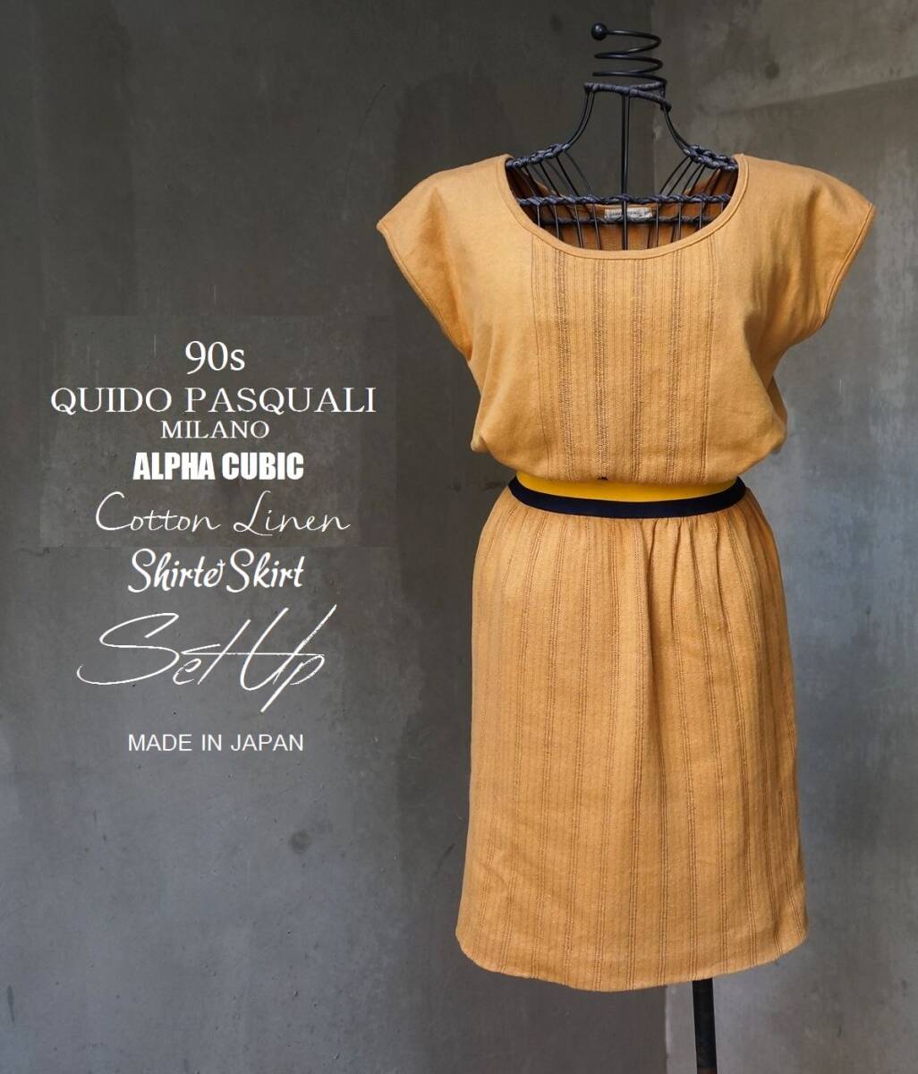 > 90s 日本製 グイドパスカーリ QUIDO PASQUALI アルファキュービック キャメル 綿麻 コットン リネン カットソー&スカート セットアップ M