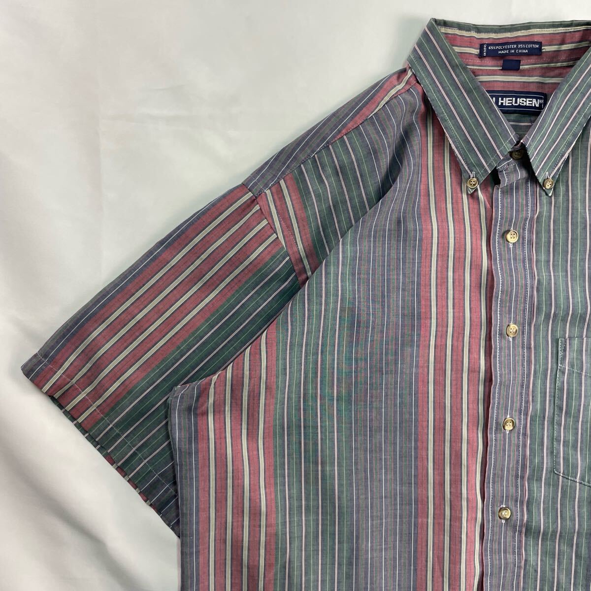 > US Vintage 90s VAN HEUSEN ポリエステル コットン 好配色 くすみカラー ボタンダウン マルチカラー ストライプ マーブルボタン 総柄シャツ