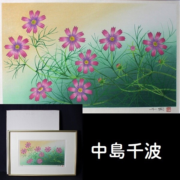- 【真作】 中島千波 「コスモス 秋桜」 木版画 限定250 直筆サイン入 美品 D778