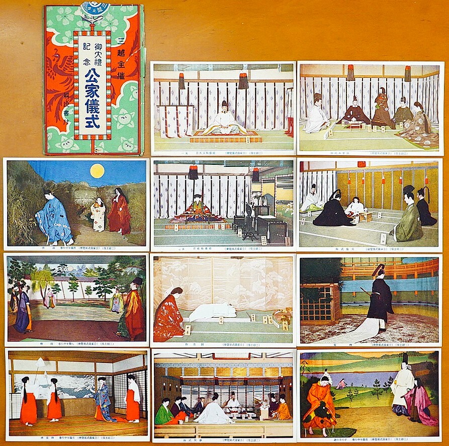 - 三越主催 御大礼記念 公家儀式 絵葉書11枚 紙袋付 解説書欠 :公家年中行事 婚儀飾姫君 御煤払 蹴鞠 撰蟲 誕生飾 元服式 検:お雛様