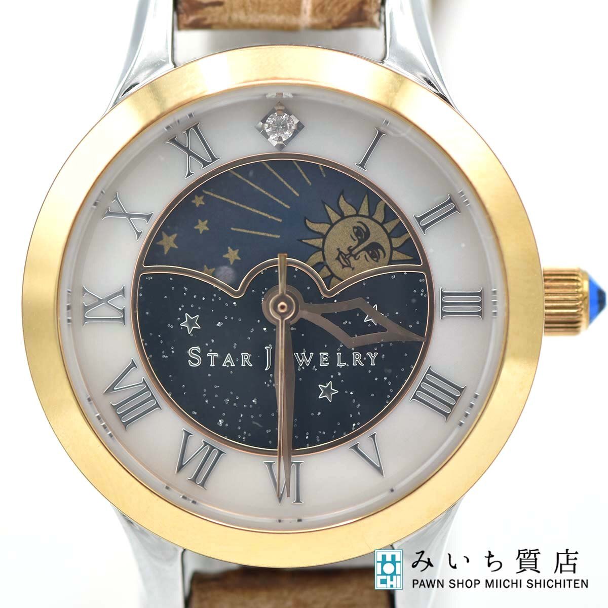 - 質屋 腕時計 稼働 STAR JEWELRY サン&ムーン デイ&ナイト クォーツ ダイヤ 0.01ct 替ベルト付 2025.3電池交換済 H10241 みいち質店