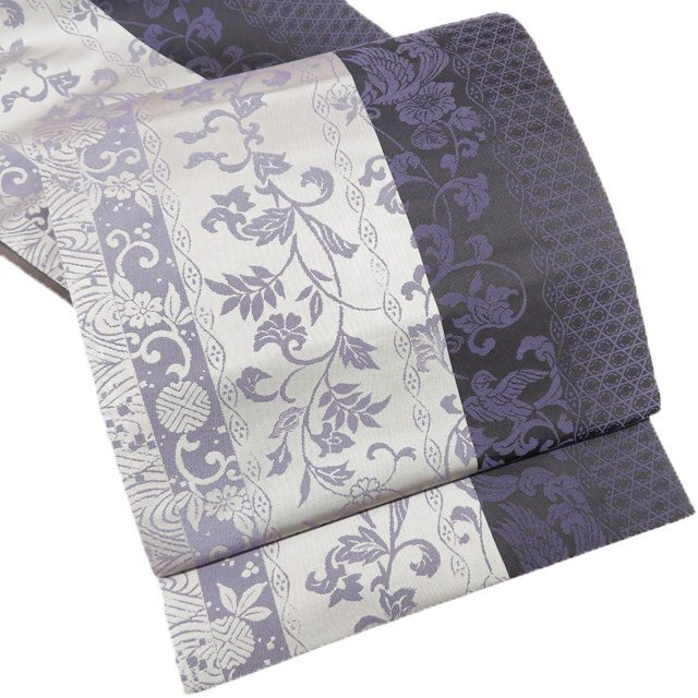 - 袋帯 中古 リサイクル 正絹 カジュアル 仕立て上がり 全通 名物裂 笹蔓緞子 絹鼠色 葡萄鼠色 消炭色 きもの北條 A1167-13