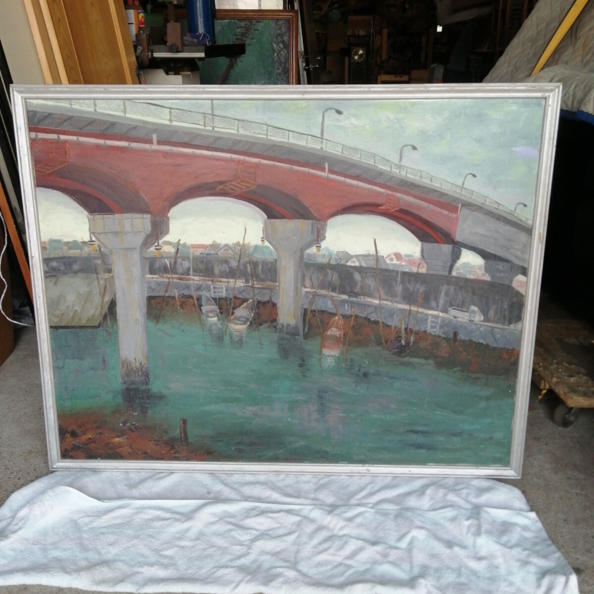 - 大型 油絵 風景画 美術品 橋 明日へ 川 船 木製額装 油彩 (約960×1220mm)