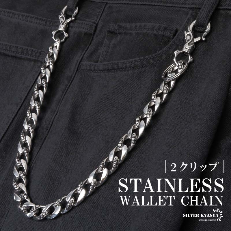 > ステンレス 重厚 ウォレットチェーン 財布 クロス 喜平チェーン 十字架 316L ごつめ 唐草 スカル 2クリップ メンズ