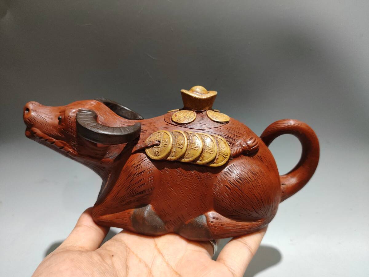 - 蔵友館蔵品 古原鉱紅泥製 招財牛壺 汪寅仙製款 紫砂壺 精品壺 煎茶道具 茶道具 極細工 古賞物 古美味 東洋彫刻 時代物 骨董 中国古美術