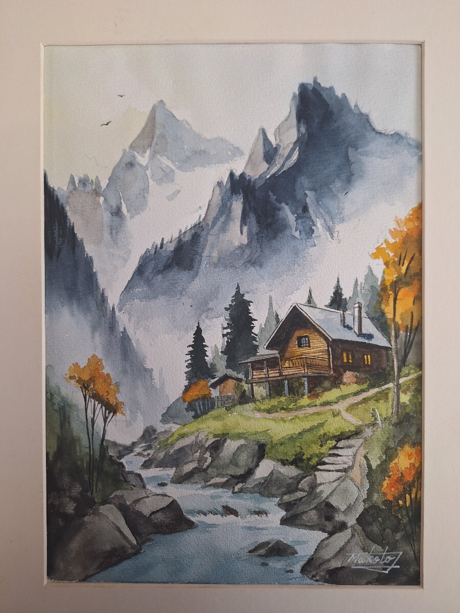- 水彩画 霧に霞む山小屋