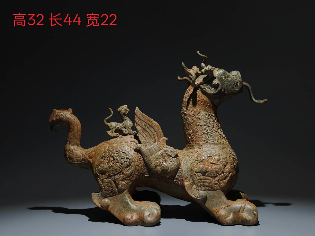 - ▽鴻▽ 戦 青銅製 蟠龍紋雙翼獣 青銅器 置物 古賞物 中国古玩 中国古美術