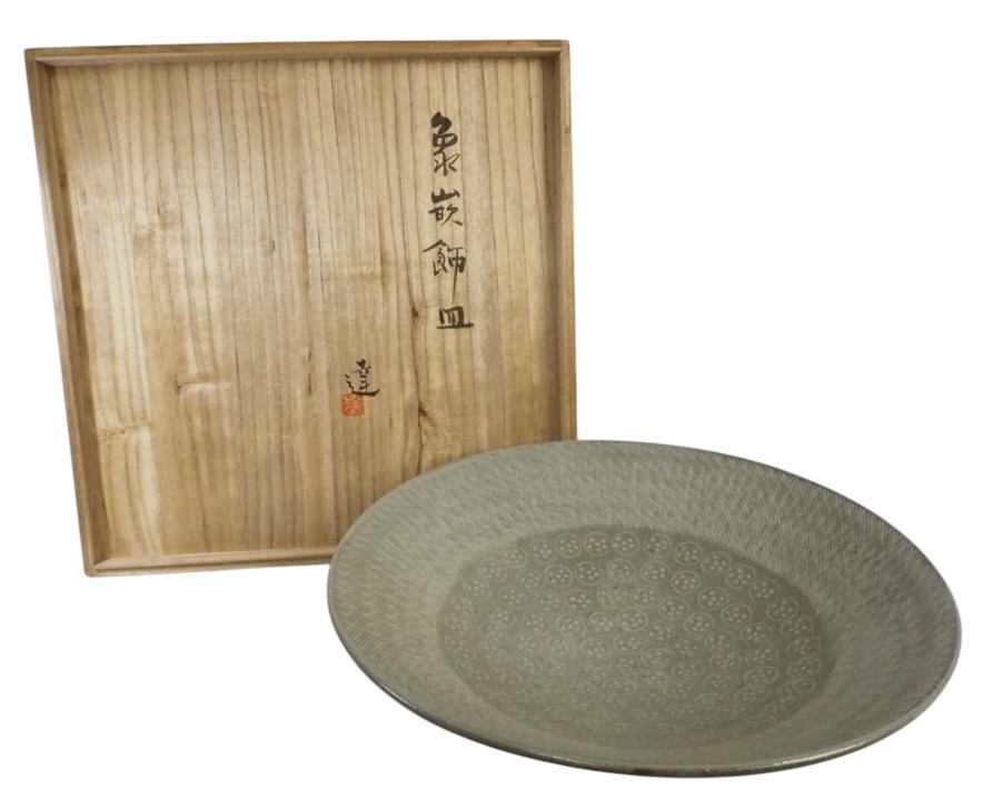 - ビンテージ 花三島 達作 象嵌飾皿 大皿 共箱付 1990年代 (皿)直径40cm 高さ10cm TMA704