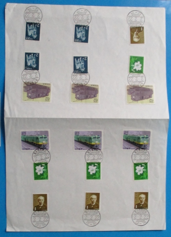 - 平成2ゾロ消印.東京蒲田駅前.櫛型消印.2.2.22、12個捺印 特製カバー(平成2並び櫛型印) 私製台紙 郵趣家作製品、切手5種18枚貼り 経年35年