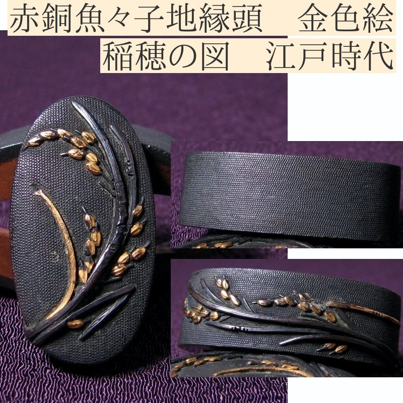 - 時代武具 赤銅魚々子地縁頭 金色絵 稲穂の図 桐箱付 江戸時代/25d016