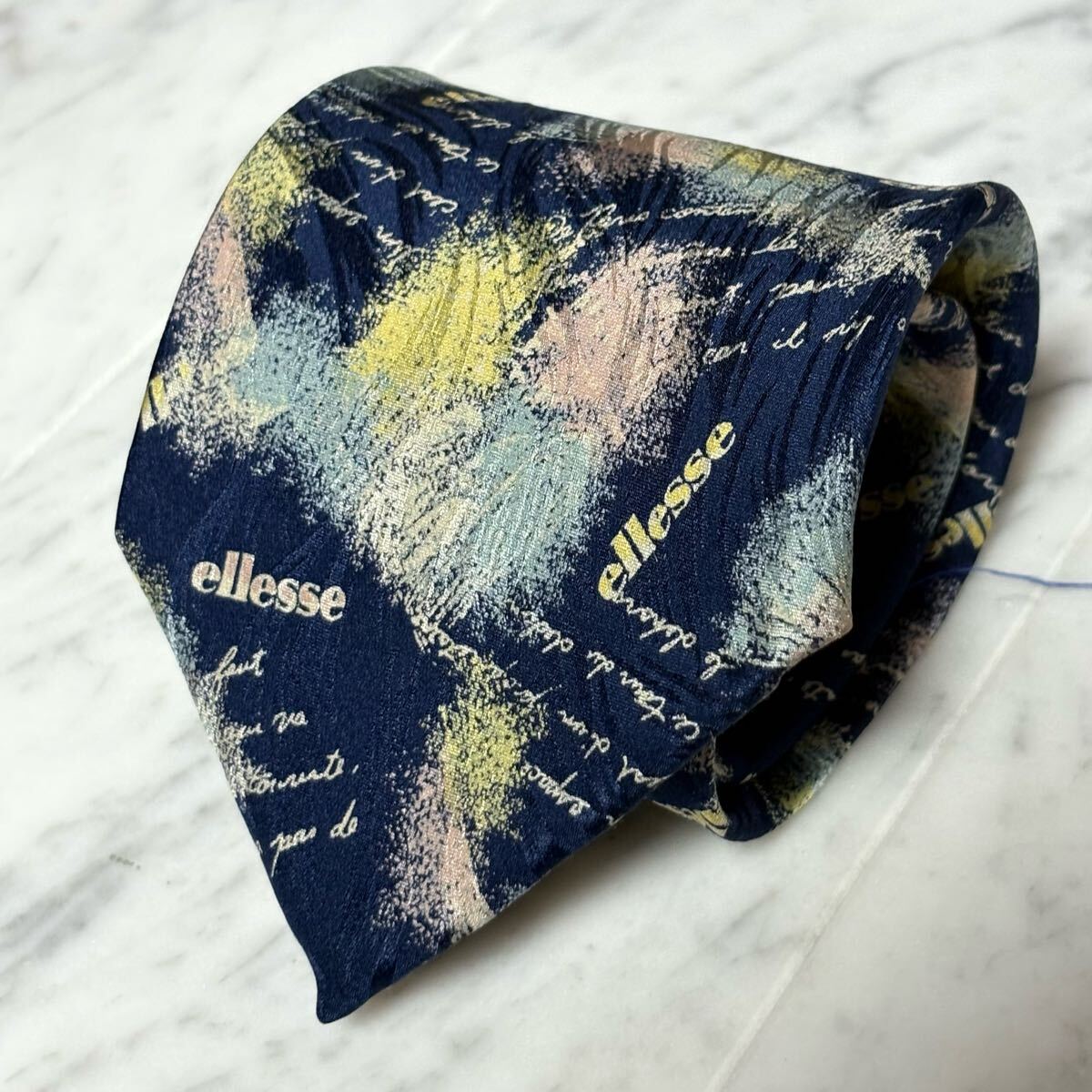 - 【美品】 999円~ ellesse ネクタイ ネイビー ロゴ 総柄 (B3)