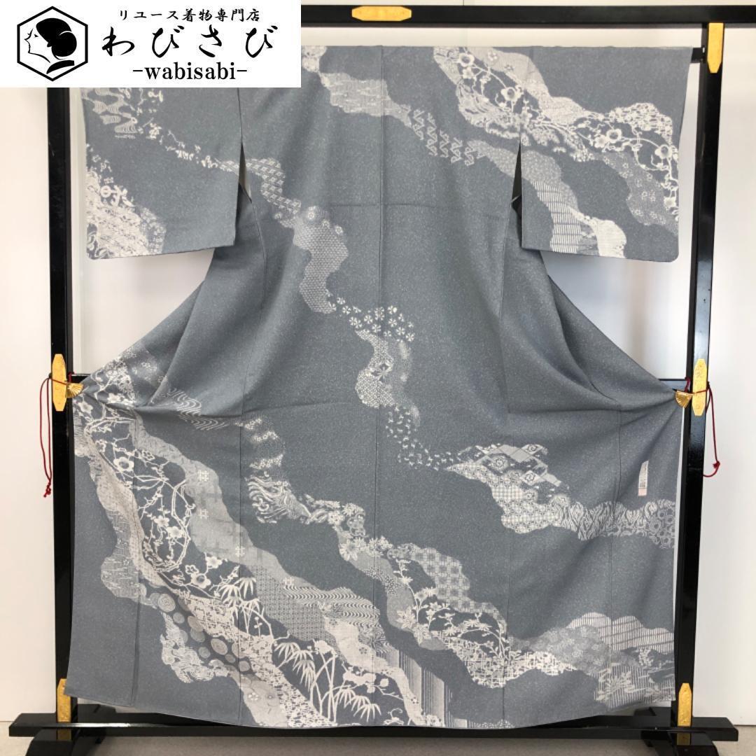 > 訪問着 作家物 古代型七十七選 道長取り 薄藍鼠色 縮緬 K-4607 着物 きもの kimono 和服 和装 中古 リサイクル着物 【送料無料】