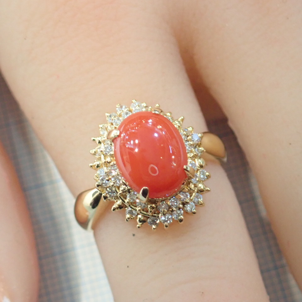 > ■K18 珊瑚リング■取巻きダイヤモンド■コーラル さんご サンゴ■指輪■中古磨き仕上げ■
