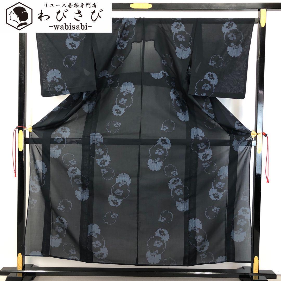 黒色ベースのお色味に雪輪に花模様の柄裄がデザインされた透け感のある素敵なお品でございます。