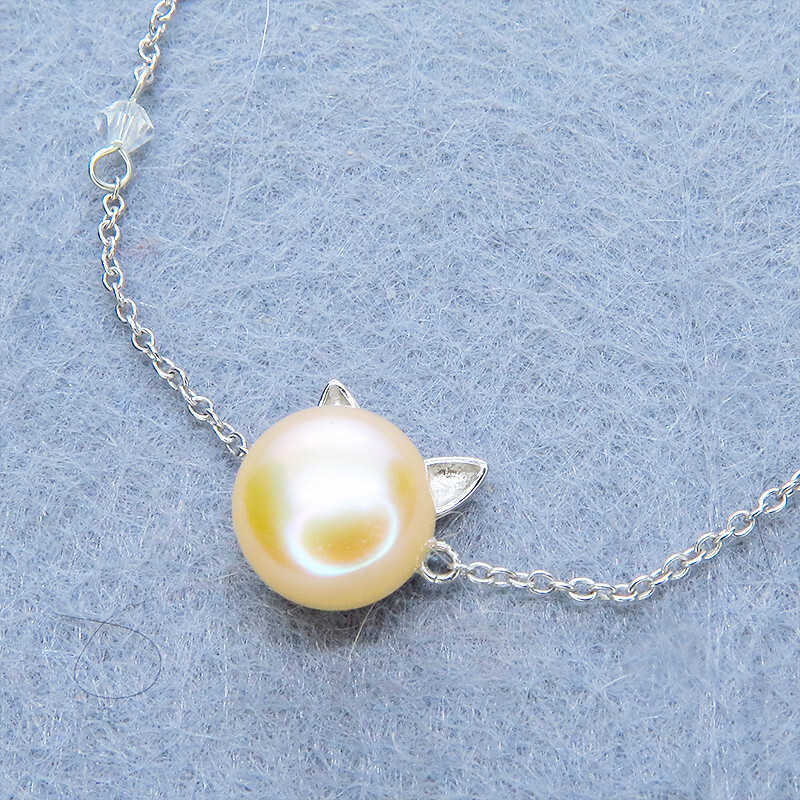 - シルバー925 猫耳パールブレスレット 淡水パール(コーラルピンク)とスワロフスキーのブレスレット