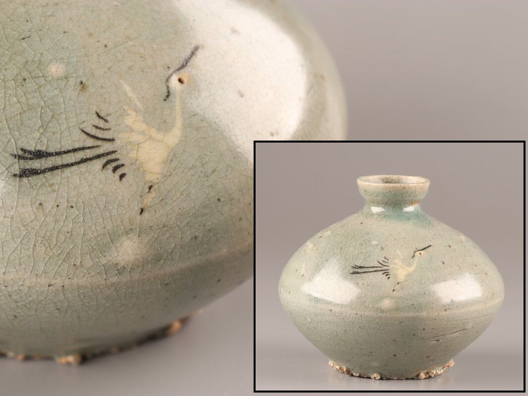 - 古美術 朝鮮古陶磁器 高麗青磁 白黒象嵌 油壷 時代物 極上品 初だし品 D2469