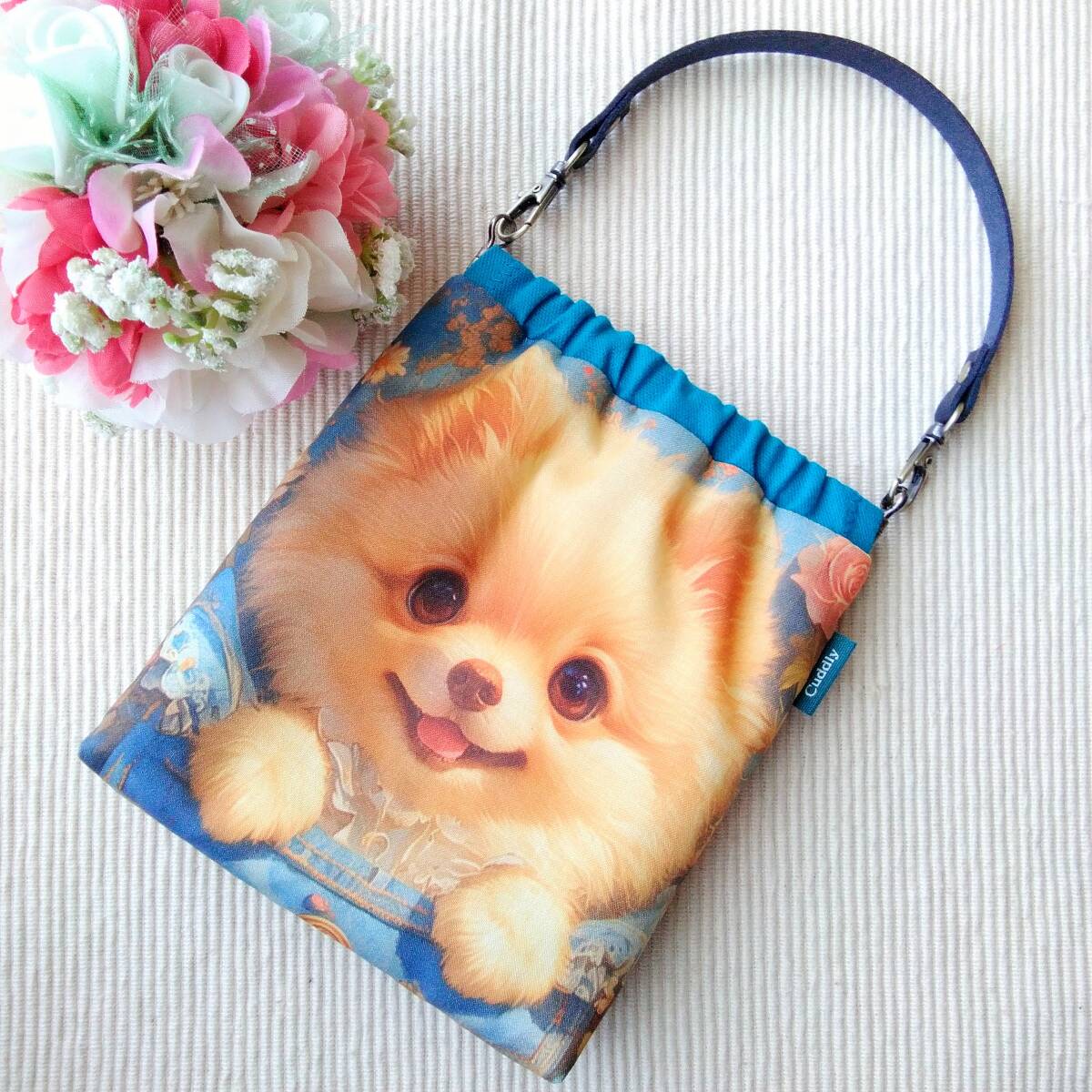 - ハンドメイド 持ち手付きバネポーチ デニムポケット ポメラニアン パネル生地