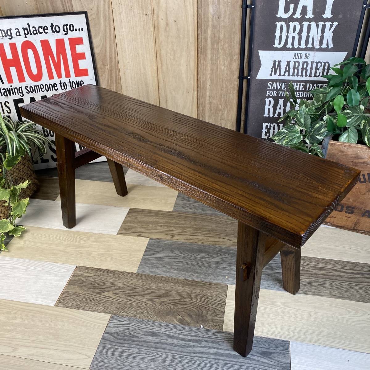 - 送料無料、アジアンエスニック原木ウッドベンチS、長椅子、腰掛け、天然木製イス、原木楡材無垢、美品、花台踏台飾り台置き台